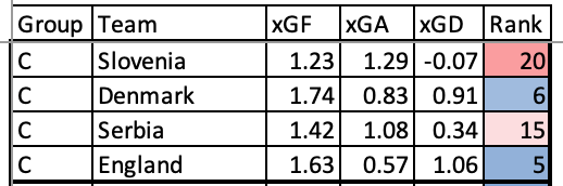 Then, I adjusted each nation’s xG by their squad value (courtesy of Transfermarkt). This helps ensure the good teams are rated above the weaker teams. Put all that together and voila we have a set of power rankings!