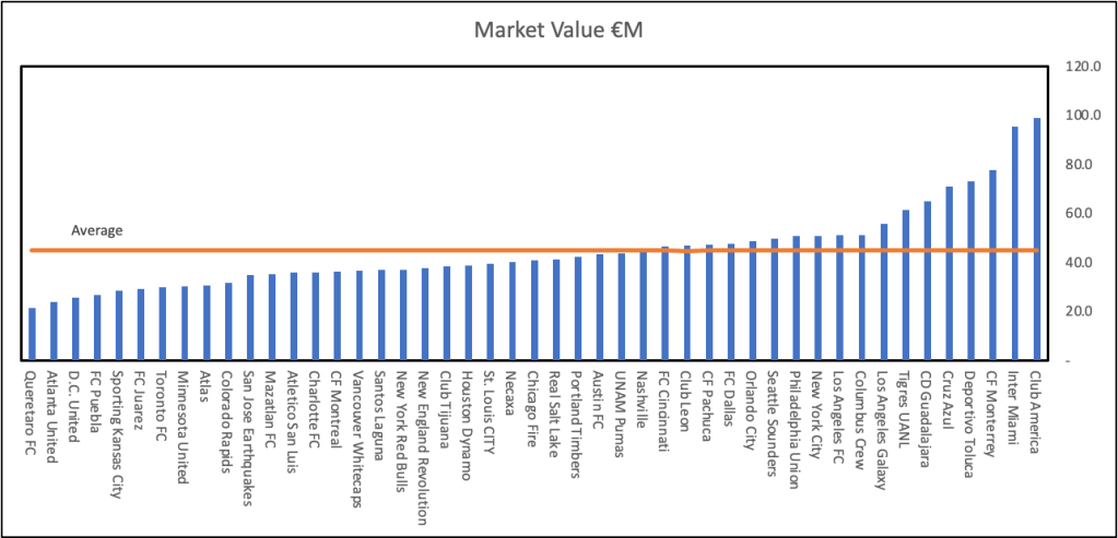 Using Transfermarkt.com, I found the Market Value for each club and adjusted based on how much more (or less) the value is compared to the average team. As you can see below, the Market Value for Club America is greater than that of Queretaro FC, so they should be rewarded for that value as I convert it to xG.