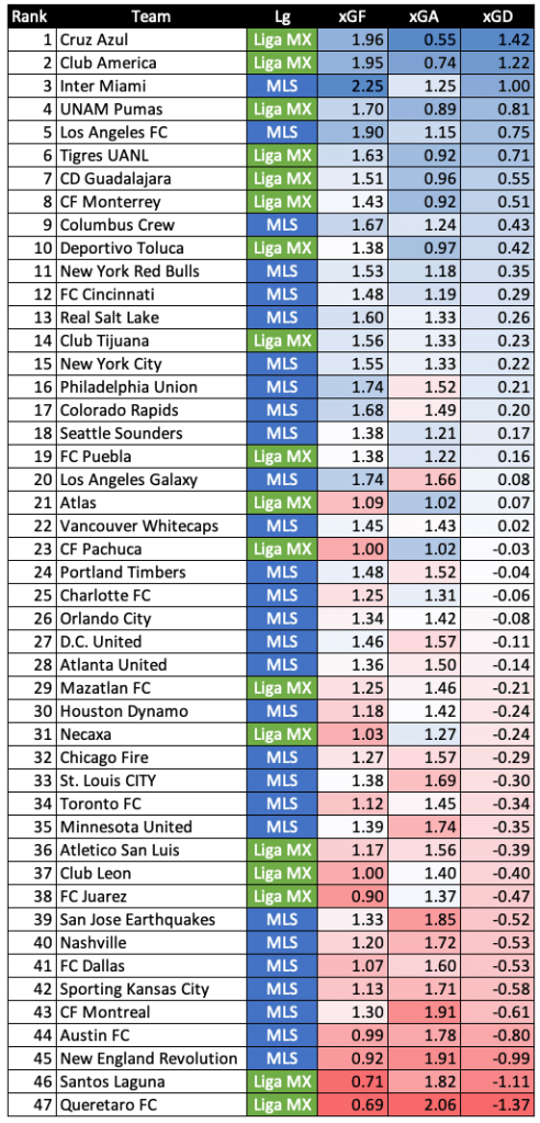 Now, let’s dive into the stats. Since these teams come from different leagues and do not play many crossover matches outside of the Leagues Cup, I took a few steps to power rank them.